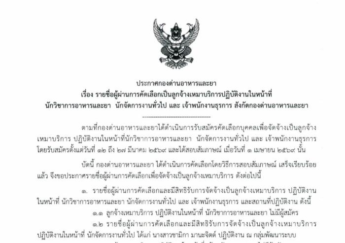ประกาศกองด่านอาหารและยา เรื่อง รายชื่อผู้ผ่านการคัดเลือกเป็นลูกจ้างเหมาบริการ